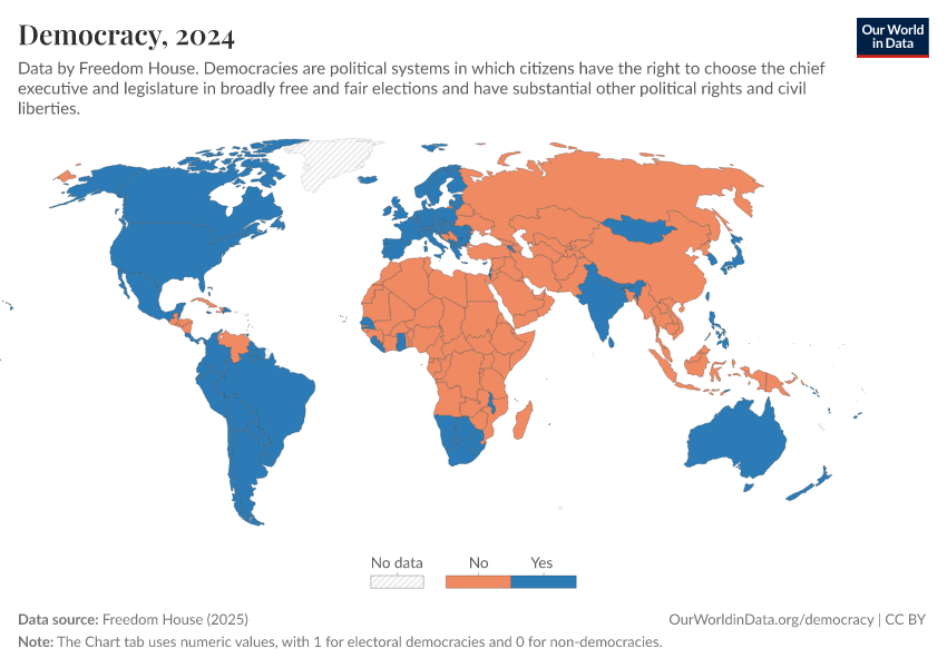 Freedom House (2025) – processed by Our World in Data. “Democracy” [dataset]. Freedom House, “Freedom in the World” [original data]. Retrieved January 16, 2026 from https://owid-bot-svg-tester-thumbnai.owid.pages.dev/grapher/political-regime-dem-fh