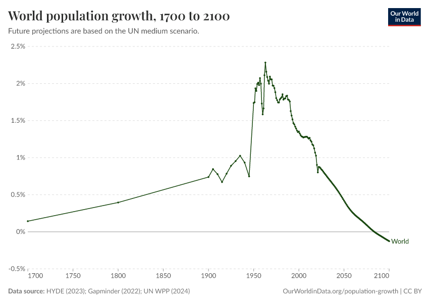 “Data Page: World population growth”, part of the following publication: Hannah Ritchie, Lucas Rodés-Guirao, Edouard Mathieu, Marcel Gerber, Esteban Ortiz-Ospina, Joe Hasell, and Max Roser (2023) - “Population Growth”. Data adapted from PBL Netherlands Environmental Assessment Agency, Gapminder, United Nations. Retrieved from https://owid-bot-svg-tester-thumbnai.owid.pages.dev/grapher/population-growth-rate [online resource]How to cite this data