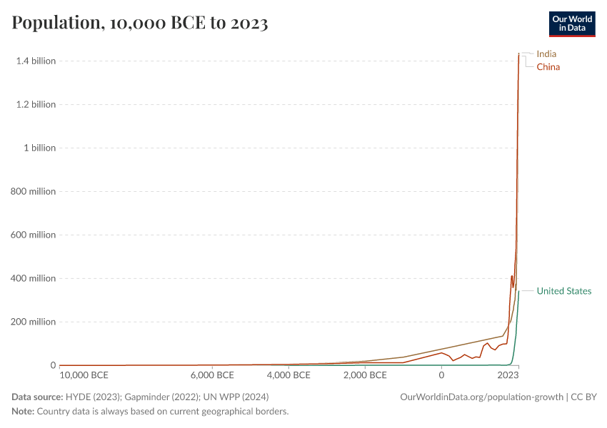 “Data Page: Population”, part of the following publication: Hannah Ritchie, Lucas Rodés-Guirao, Edouard Mathieu, Marcel Gerber, Esteban Ortiz-Ospina, Joe Hasell, and Max Roser (2023) - “Population Growth”. Data adapted from PBL Netherlands Environmental Assessment Agency, Gapminder, United Nations. Retrieved from https://owid-bot-svg-tester-thumbnai.owid.pages.dev/grapher/population [online resource]