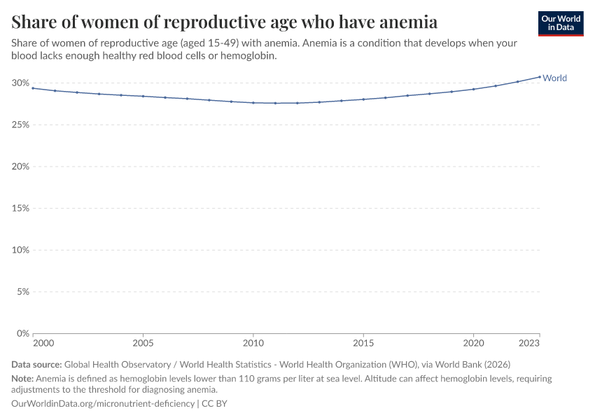 “Data Page: Share of women of reproductive age who have anemia”. Our World in Data (2026). Data adapted from Global Health Observatory / World Health Statistics - World Health Organization (WHO), via World Bank. Retrieved from https://owid-bot-svg-tester-thumbnai.owid.pages.dev/grapher/prevalence-of-anemia-in-women-of-reproductive-age-aged-15-29 [online resource]How to cite this data