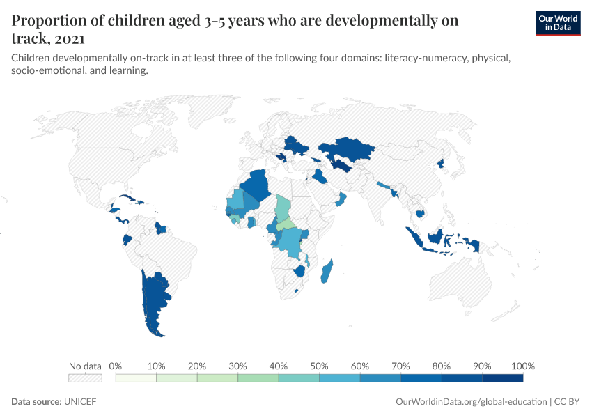 “Data Page: Proportion of children aged 3-5 years who are developmentally on track”. Our World in Data (2026). Data adapted from UNICEF. Retrieved from https://owid-bot-svg-tester-thumbnai.owid.pages.dev/grapher/proportion-of-children-developmentally-on-track [online resource]How to cite this data