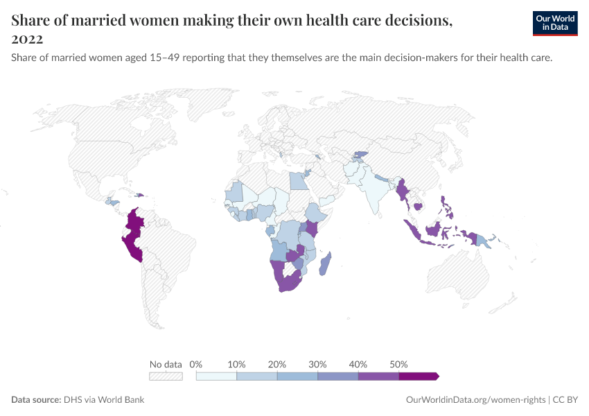“Data Page: Share of married women making their own health care decisions”, part of the following publication: Bastian Herre, Veronika Samborska, Pablo Arriagada, and Hannah Ritchie (2023) - “Women’s Rights”. Data adapted from World Bank Gender Statistics. Retrieved from https://owid-bot-svg-tester-thumbnai.owid.pages.dev/grapher/proportion-of-women-who-make-their-own-informed-health-care-decisions [online resource]How to cite this data