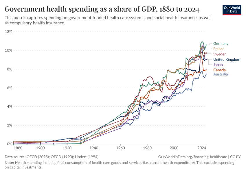 OECD (2025); OECD (1993); Lindert (1994) – with major processing by Our World in Data. “Public health expenditure as a share of GDP – Lindert, OECD – Historical data” [dataset]. OECD, “OECD Health Expenditure and Financing Database”; OECD, “OECD Health Systems”; Lindert, “The rise of social spending (1880-1930)” [original data]. Retrieved January 16, 2026 from https://owid-bot-svg-tester-thumbnai.owid.pages.dev/grapher/public-health-expenditure-share-gdp