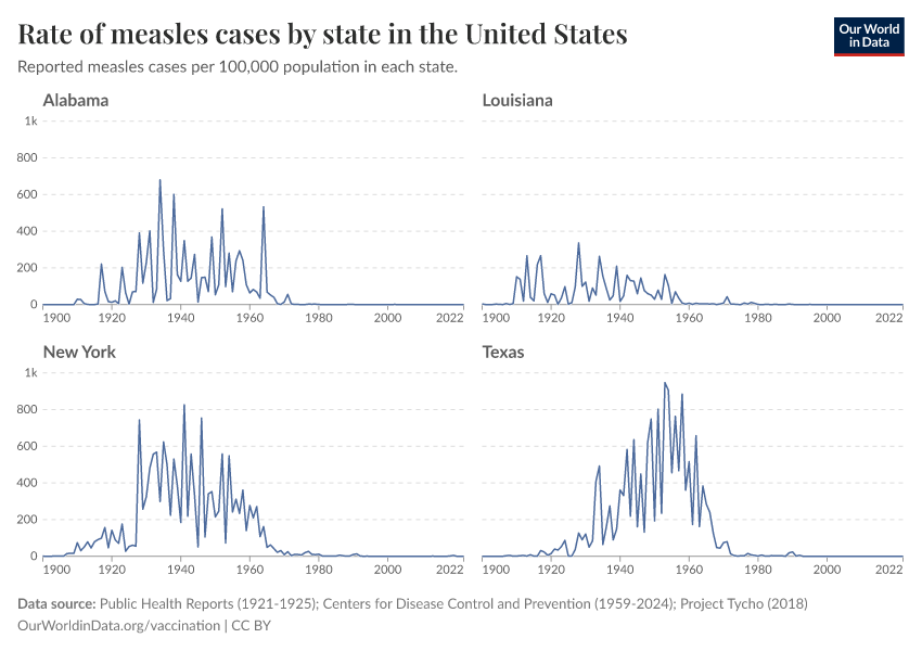 Public Health Reports (1921-1925); Centers for Disease Control and Prevention (1959-2024); Project Tycho (2018) – with major processing by Our World in Data. “Rate of measles cases by state in the United States” [dataset]. Project Tycho, “Project Tycho - Measles cases”; Centers for Disease Prevention and Control, “CDC Summary of Notifiable Infectious Diseases - Measles”; Centers for Disease Control and Prevention, “Reported measles cases - CDC”; Centers for Disease Control and Prevention, “National Notifiable Diseases Surveillance System - Measles”; U.S. Census Bureau, “Annual Estimates of the Population for each of the States in the USA” [original data]. Retrieved January 16, 2026 from https://owid-bot-svg-tester-thumbnai.owid.pages.dev/grapher/reported-measles-case-rate-by-state-in-the-united-states