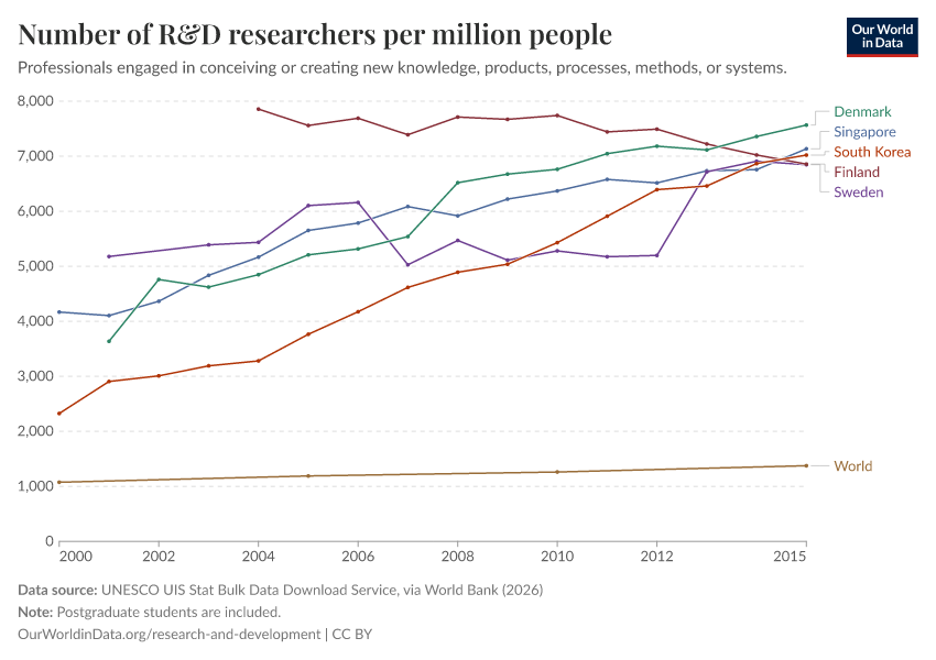 “Data Page: Number of R&D researchers per million people”. Our World in Data (2026). Data adapted from UNESCO UIS Stat Bulk Data Download Service, via World Bank. Retrieved from https://owid-bot-svg-tester-thumbnai.owid.pages.dev/grapher/researchers-in-rd-per-million-people [online resource]How to cite this data