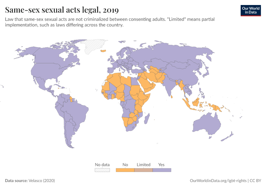 “Data Page: Same-sex sexual acts legal”, part of the following publication: Bastian Herre and Pablo Arriagada (2023) - “LGBT+ Rights”. Data adapted from Velasco. Retrieved from https://owid-bot-svg-tester-thumbnai.owid.pages.dev/grapher/same-sex-sexual-acts-legal [online resource]How to cite this data