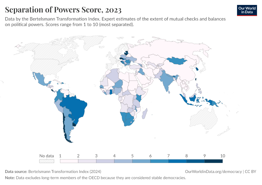 “Data Page: Separation of powers score”, part of the following publication: Bastian Herre, Lucas Rodés-Guirao, and Esteban Ortiz-Ospina (2013) - “Democracy”. Data adapted from Bertelsmann Transformation Index. Retrieved from https://owid-bot-svg-tester-thumbnai.owid.pages.dev/grapher/separation-of-powers-score-bti [online resource]How to cite this data
