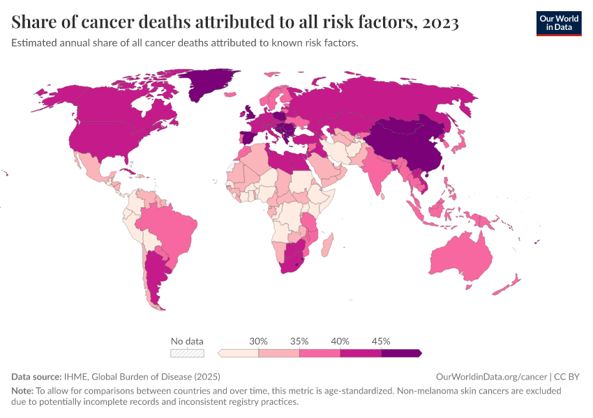 “Data Page: Share of cancer deaths attributed to all risk factors”, part of the following publication: Esteban Ortiz-Ospina and Max Roser (2016) - “Global Health”. Data adapted from IHME, Global Burden of Disease. Retrieved from https://owid-bot-svg-tester-thumbnai.owid.pages.dev/grapher/share-of-cancer-deaths-attributed-to-all-risk-factors [online resource]How to cite this data