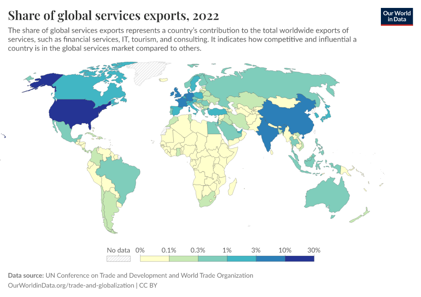 “Data Page: Share of global services exports”. Our World in Data (2026). Data adapted from UN Conference on Trade and Development and World Trade Organization. Retrieved from https://owid-bot-svg-tester-thumbnai.owid.pages.dev/grapher/share-of-global-services-exports [online resource]How to cite this data