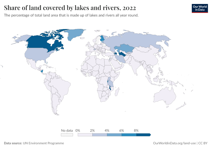 “Data Page: Share of land covered by lakes and rivers”. Our World in Data (2026). Data adapted from UN Environment Programme. Retrieved from https://owid-bot-svg-tester-thumbnai.owid.pages.dev/grapher/share-of-land-covered-by-lakes-and-rivers [online resource]How to cite this data
