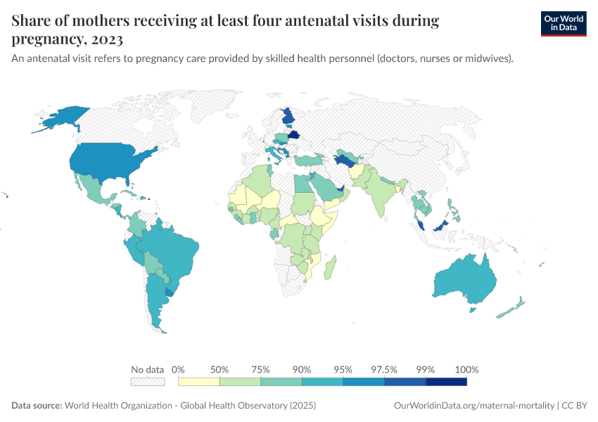 “Data Page: Share of mothers receiving at least four antenatal visits during pregnancy”. Our World in Data (2026). Data adapted from World Health Organization. Retrieved from https://owid-bot-svg-tester-thumbnai.owid.pages.dev/grapher/share-of-mothers-receiving-at-least-four-antenatal-visits-during-pregnancy [online resource]How to cite this data