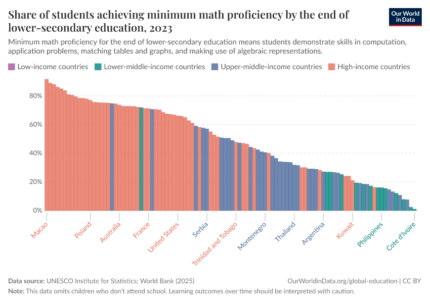 UNESCO Institute for Statistics – processed by Our World in Data. “Share of students achieving minimum math proficiency by the end of lower-secondary education” [dataset]. UNESCO Institute for Statistics, “Data from multiple sources” [original data]. Retrieved January 16, 2026 from https://owid-bot-svg-tester-thumbnai.owid.pages.dev/grapher/share-of-students-at-end-of-lower-secondary-education-achieving-minimum-math-proficiency