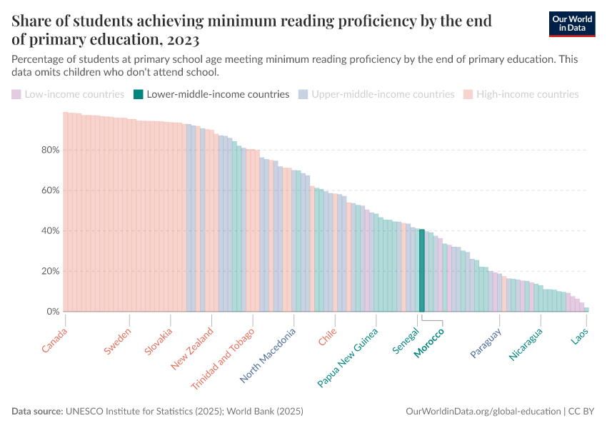 “Data Page: Share of students achieving minimum reading proficiency by the end of primary education”, part of the following publication: Hannah Ritchie, Veronika Samborska, Esteban Ortiz-Ospina, and Max Roser (2023) - “Global Education”. Data adapted from UNESCO Institute for Statistics. Retrieved from https://owid-bot-svg-tester-thumbnai.owid.pages.dev/grapher/share-of-students-at-end-of-primary-education-achieving-minimum-reading-proficiency [online resource]