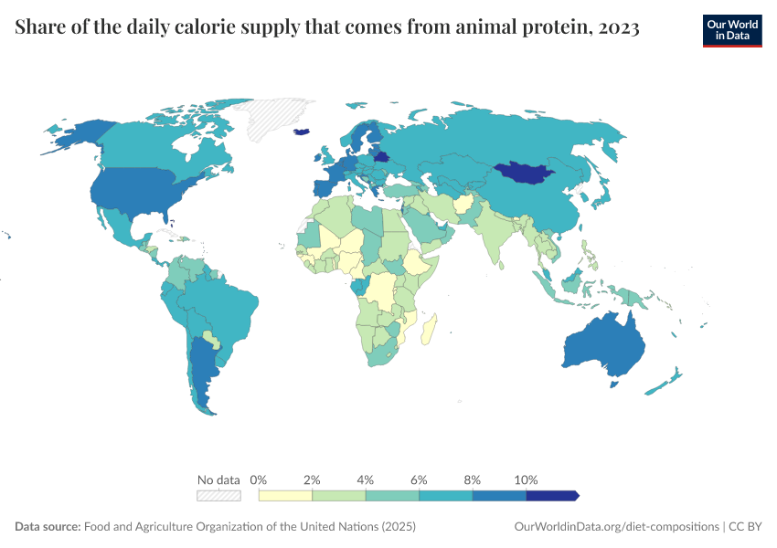 “Data Page: Share of the daily calorie supply that comes from animal protein”, part of the following publication: Hannah Ritchie, Pablo Rosado, and Max Roser (2023) - “Agricultural Production”. Data adapted from Food and Agriculture Organization of the United Nations. Retrieved from https://owid-bot-svg-tester-thumbnai.owid.pages.dev/grapher/share-of-the-daily-calorie-supply-that-comes-from-animal-protein [online resource]How to cite this data