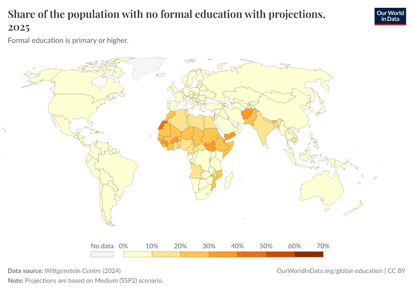 “Data Page: Share of the population with no formal education with projections”, part of the following publication: Hannah Ritchie, Veronika Samborska, Esteban Ortiz-Ospina, and Max Roser (2023) - “Global Education”. Data adapted from Wittgenstein Centre. Retrieved from https://owid-bot-svg-tester-thumbnai.owid.pages.dev/grapher/share-of-the-population-with-no-formal-education-with-projections [online resource]How to cite this data