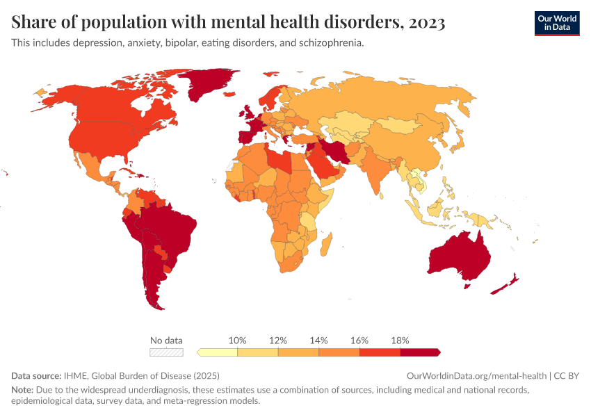 IHME, Global Burden of Disease (2024) – with major processing by Our World in Data. “Share of population with mental health disorders” [dataset]. IHME, Global Burden of Disease, “Global Burden of Disease - Prevalence and Incidence” [original data]. Retrieved January 16, 2026 from https://owid-bot-svg-tester-thumbnai.owid.pages.dev/grapher/share-with-mental-and-substance-disorders