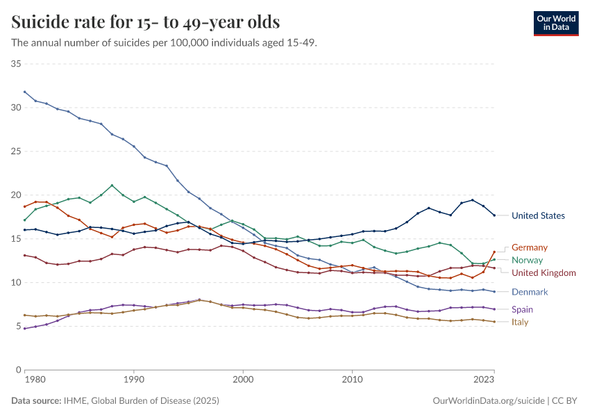 “Data Page: Suicide rate for 15- to 49-year olds”, part of the following publication: Esteban Ortiz-Ospina and Max Roser (2016) - “Global Health”. Data adapted from IHME, Global Burden of Disease. Retrieved from https://owid-bot-svg-tester-thumbnai.owid.pages.dev/grapher/suicide-rate-for-15--to-49-year-olds [online resource]How to cite this data