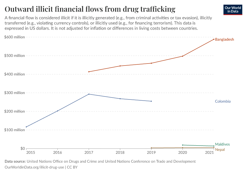 “Data Page: Outward illicit financial flows from drug trafficking”. Our World in Data (2026). Data adapted from United Nations Office on Drugs and Crime and United Nations Conference on Trade and Development. Retrieved from https://owid-bot-svg-tester-thumbnai.owid.pages.dev/grapher/total-outward-financial-flows-from-drug-trafficking [online resource]How to cite this data