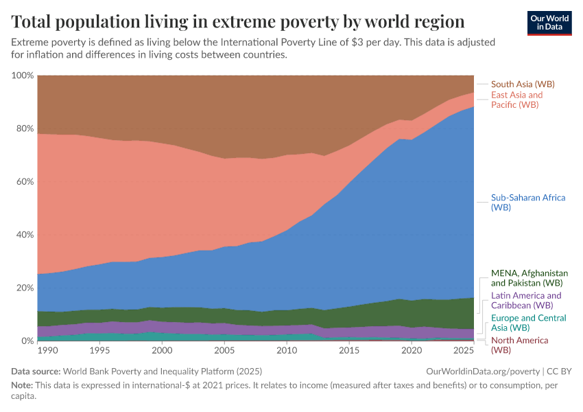 World Bank Poverty and Inequality Platform (2025) – with major processing by Our World in Data. “Total population living in extreme poverty by world region – World Bank” [dataset]. World Bank Poverty and Inequality Platform, “World Bank Poverty and Inequality Platform (PIP) 20250930_2021, 20250930_2017” [original data]. Retrieved January 16, 2026 from https://owid-bot-svg-tester-thumbnai.owid.pages.dev/grapher/total-population-living-in-extreme-poverty-by-world-region