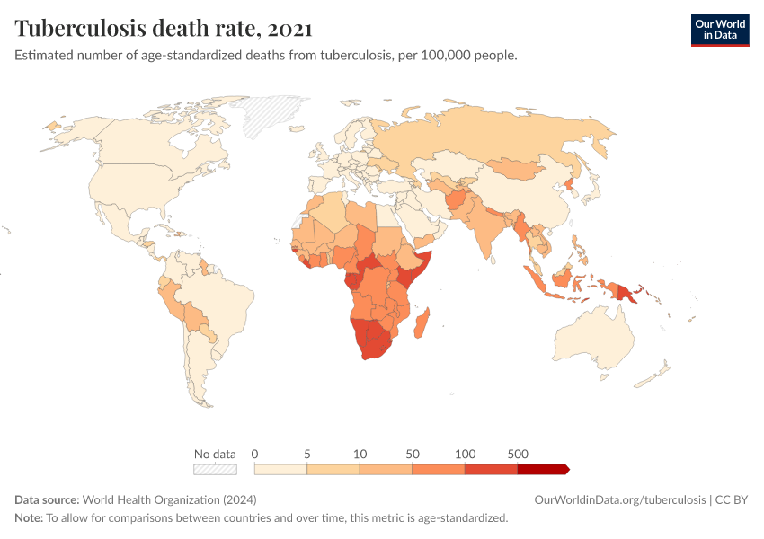 World Health Organization (2024) – with major processing by Our World in Data. “Tuberculosis death rate” [dataset]. World Health Organization, “Global Health Estimates” [original data]. Retrieved January 16, 2026 from https://owid-bot-svg-tester-thumbnai.owid.pages.dev/grapher/tuberculosis-death-rate-age-standardized