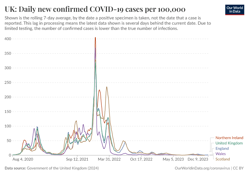 Government of the United Kingdom (2024) – with minor processing by Our World in Data. “UK: Daily new confirmed COVID-19 cases per 100,000” [dataset]. Government of the United Kingdom, “UKHSA data dashboard” [original data]. Retrieved January 16, 2026 from https://owid-bot-svg-tester-thumbnai.owid.pages.dev/grapher/uk-daily-covid-cases-7day-average