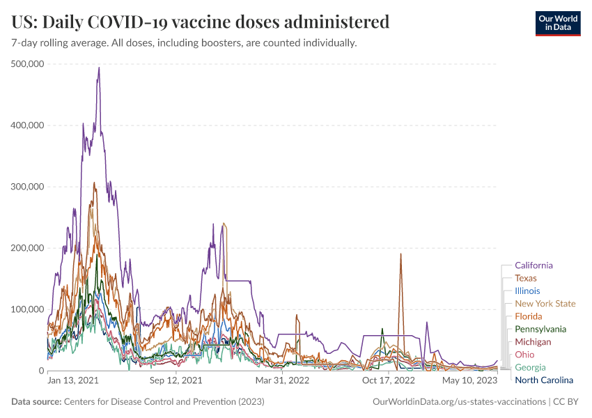Centers for Disease Control and Prevention (2023) – processed by Our World in Data. “US: Daily COVID-19 vaccine doses administered” [dataset]. Centers for Disease Control and Prevention, “COVID-19, Vaccinations (United States)” [original data]. Retrieved January 16, 2026 from https://owid-bot-svg-tester-thumbnai.owid.pages.dev/grapher/us-daily-covid-vaccine-doses-administered
