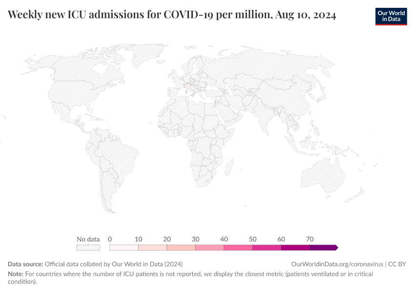 • Hospital and ICU data are sourced from official providers and collated by Our World in Data, but no new datapoints have been added since 13 August 2024.