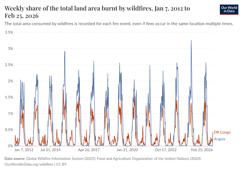 “Data Page: Weekly share of the total land area burnt by wildfires”, part of the following publication: Hannah Ritchie, Pablo Rosado, and Veronika Samborska (2024) - “Climate Change”. Data adapted from Global Wildfire Information System, Food and Agriculture Organization of the United Nations. Retrieved from https://owid-bot-svg-tester-thumbnai.owid.pages.dev/grapher/weekly-share-of-the-total-land-area-burnt-by-wildfires [online resource]How to cite this data