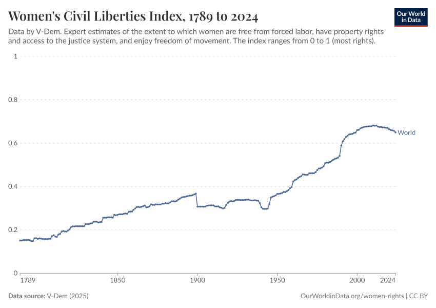 V-Dem (2025) – processed by Our World in Data. “Women's civil rights index – V-Dem” [dataset]. V-Dem, “Democracy report v15” [original data]. Retrieved January 16, 2026 from https://owid-bot-svg-tester-thumbnai.owid.pages.dev/grapher/women-civil-liberties-index