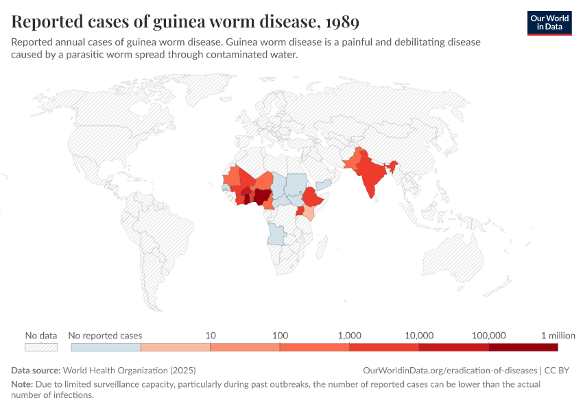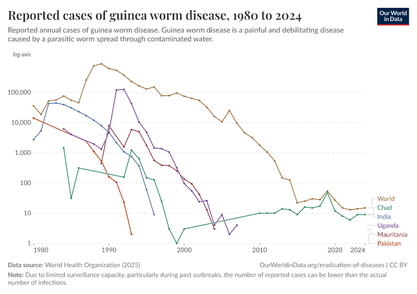 You can see the change since the start of the eradication campaign in the chart. Cases of guinea worm disease declined rapidly across many countries.