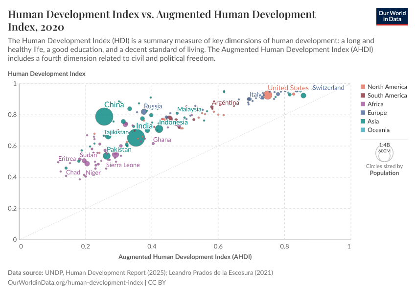 Like the HDI, the AHDI characterizes human development as people having long and healthy lives, being knowledgeable, and having a decent standard of living. But AHDI adds a fourth dimension — civil and political freedom — and is based on slightly different indicators: