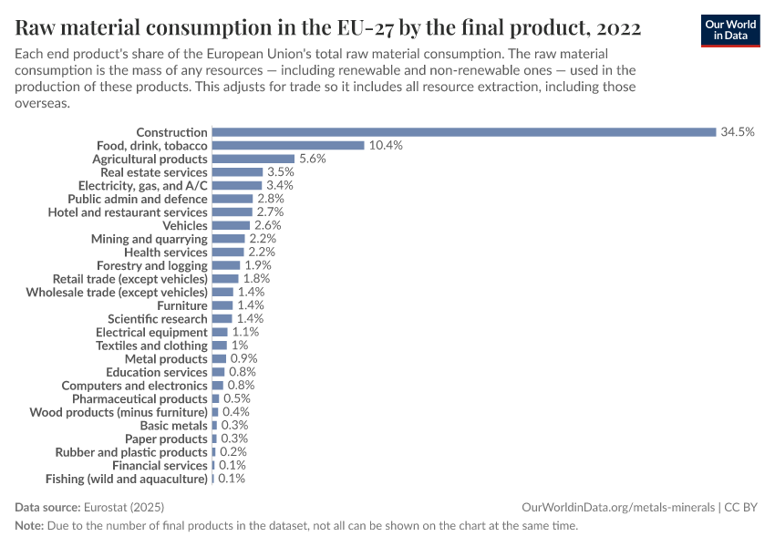 But, surprisingly, thinking carefully about these purchases is not advice that follows from looking at material footprints. The chart below shows the breakdown of the EU’s material consumption, this time by final product. We see that these consumer products account for a very small fraction of the total footprint.4
