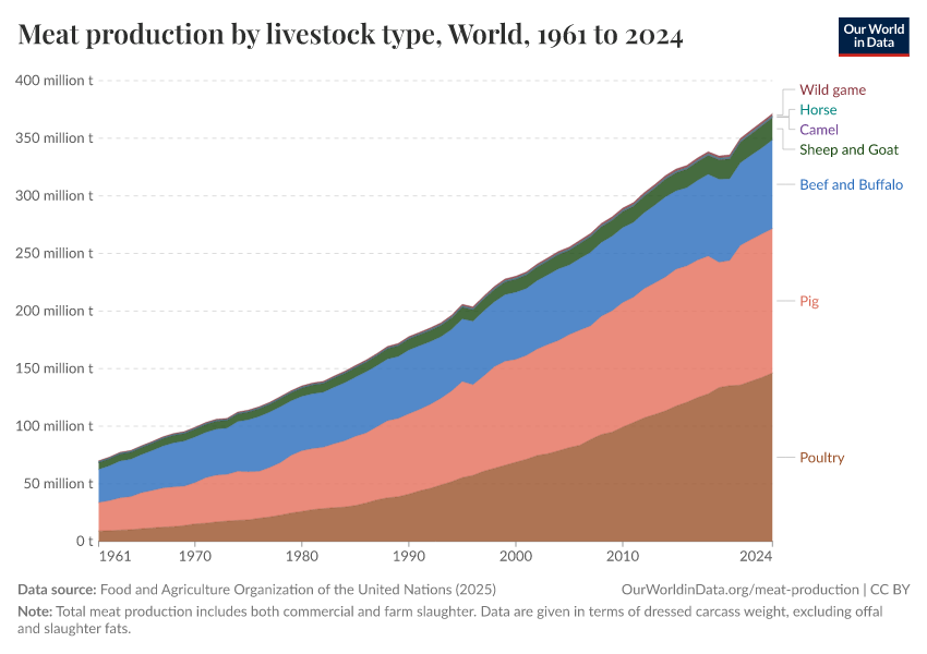 In the chart, we see how meat production has changed by livestock type since 1961.