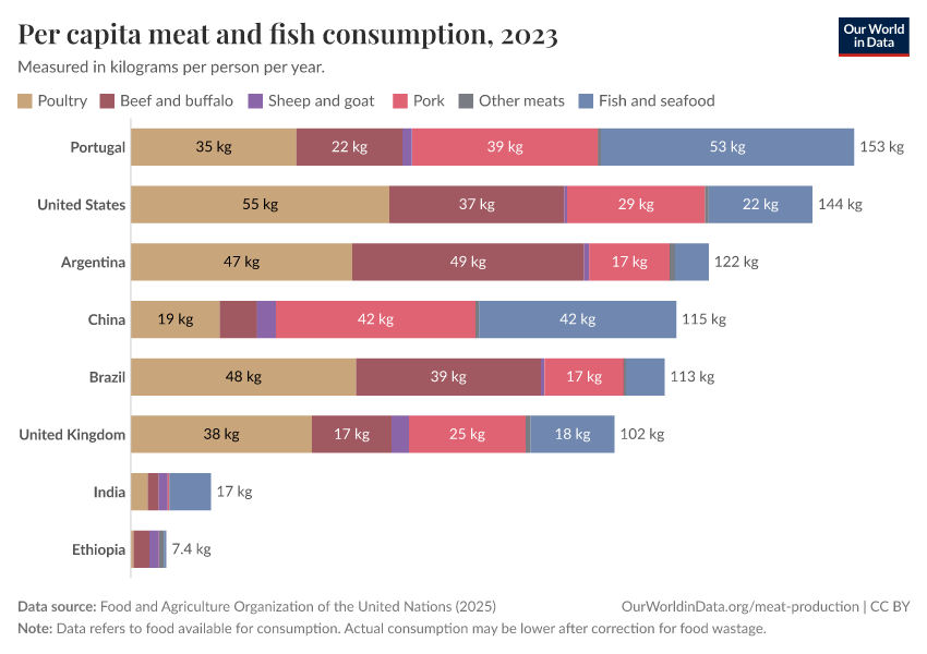 In the charts here we see the per capita consumption of different meat types by country.