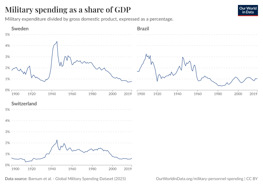 How much do countries spend on the military in the absence of major violent conflict? The chart shown here focuses on Sweden, Brazil and Switzerland. As we can see, despite broad reductions in recent years, all these countries have kept levels of military spending close to 1% of GDP. In all these countries the level today is similar to what it was at the turn of the 20th century.