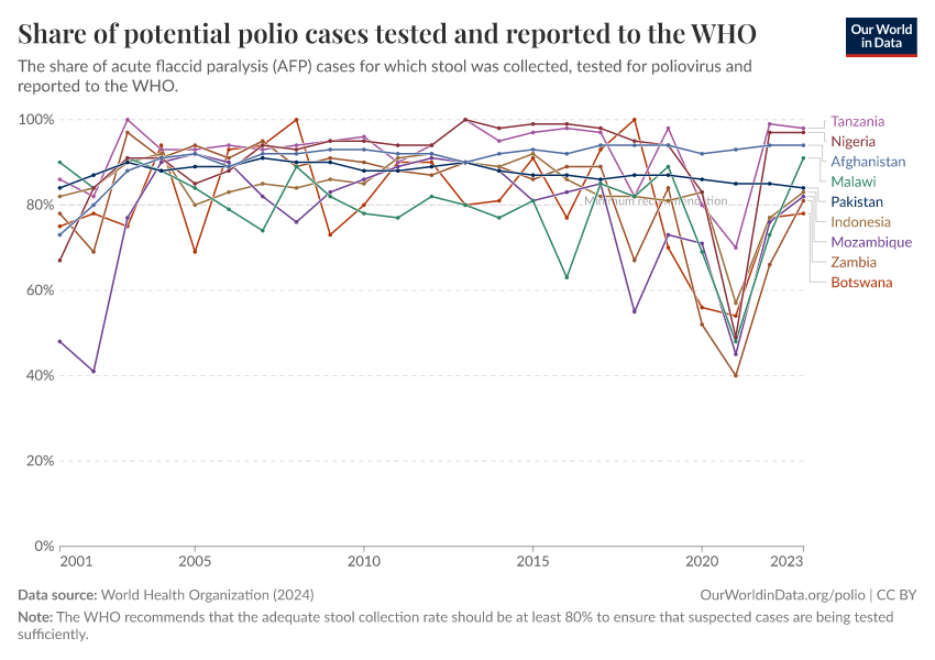 To do this, we look at the percentage of paralysis cases that have stool samples taken to test for polio. The higher this percentage, the more potential cases are being tested to confirm whether they are infected by the poliovirus.