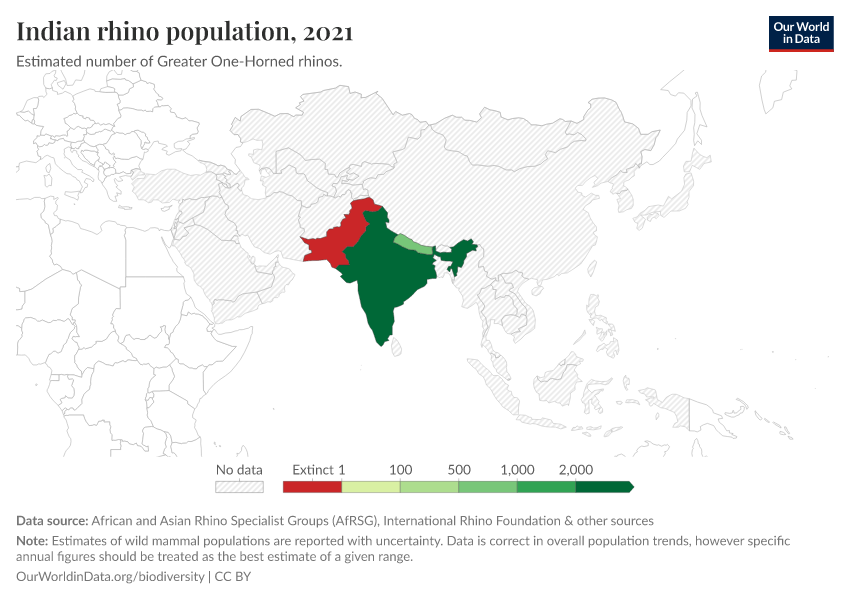 By the mid-20th century, there were very few Indian Rhinos left in the world. It’s estimated (with larger uncertainty since it predates regular surveying) that there were only 40 individuals left.