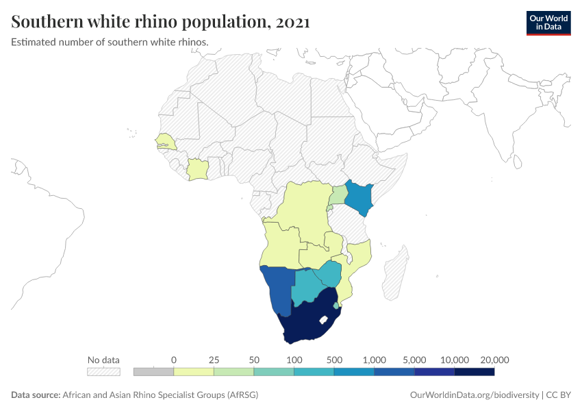 Over the last few years, increases in poaching rates have unfortunately led to another decline. South Africa is home to around three-quarters of Southern White Rhinos. You can explore population estimates by country in the chart.