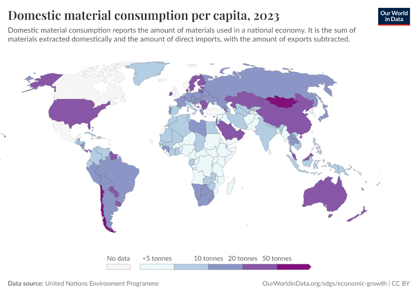 Domestic Material Consumption measures the total amount of material directly used in an economy. It measures material production, rather than consumption because it is not adjusted for trade.