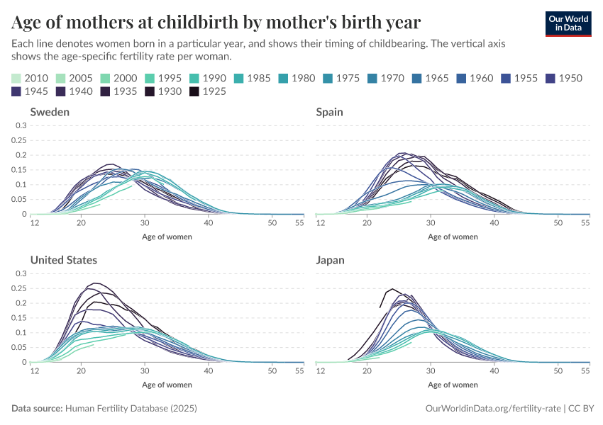In Sweden, for example, the curve has shifted to the right: younger generations of women are having children later than in the past, but this hasn’t led to a drop in the average number of children per woman.
