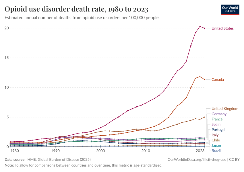 This chart shows the death rate from opioid overdoses. This is a cause of death where the US very clearly stands out.