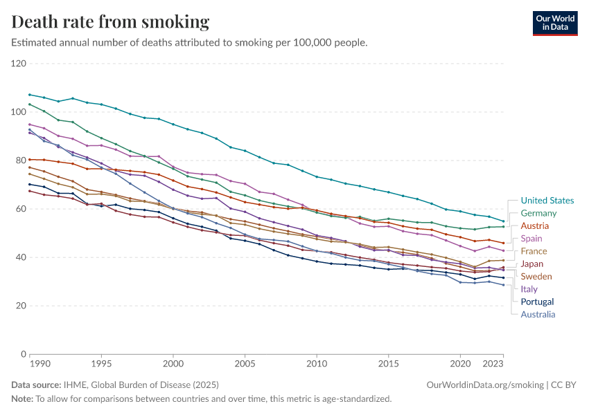 Smoking was extremely common in today’s rich countries between 1950 and 2000 as the chart below shows. Smoking was more widespread in the US than in Europe or Japan. As a consequence Americans died at higher rates from the consequences of smoking as the second chart shows (most of these people died from lung cancer).