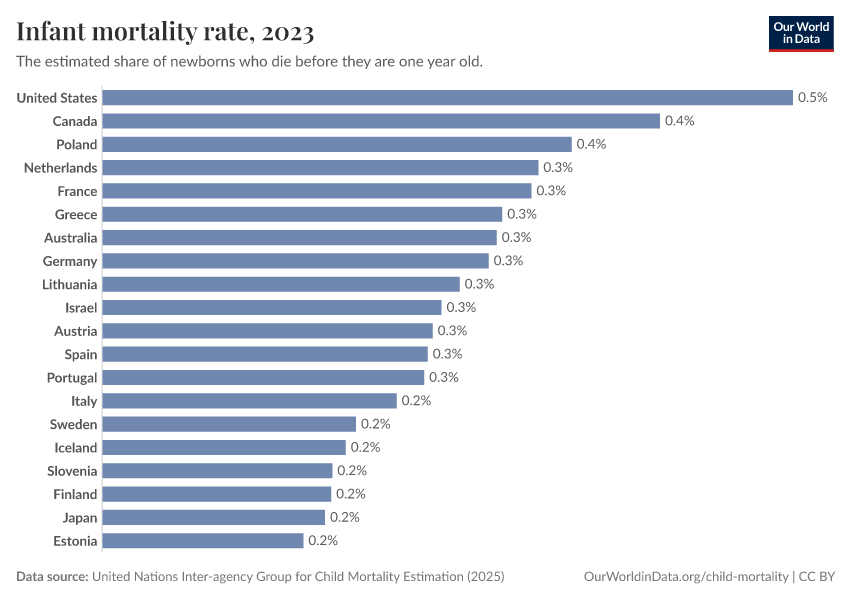 Infant mortality – the share of infants that don’t survive the first year of their life – is higher in the US than in just about every other rich country. You can again add countries to the chart here. High infant mortality matters very much for life expectancy as the very short life span pulls down the average strongly.