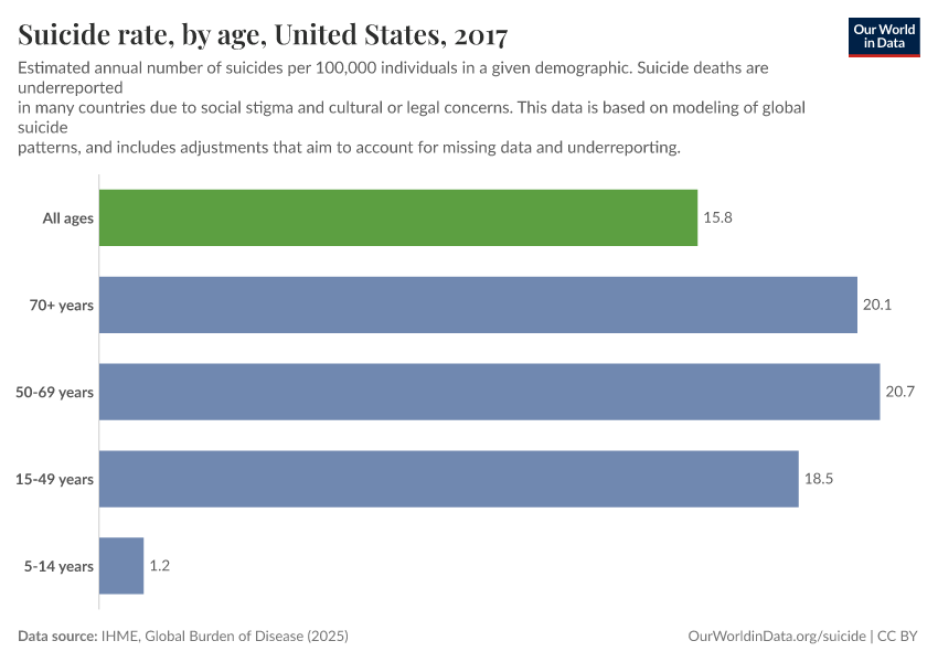 This is not the case in many other rich countries – you can switch to any other country in the world in the chart. Also, globally suicide rates have fallen substantially over recent years.