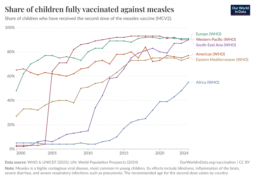 This has been a truly global effort, with more than 5 million children saved in every region, including over 50 million in Africa and 38 million in Southeast Asia. You can see the cumulative number of lives saved by WHO region in the chart below.