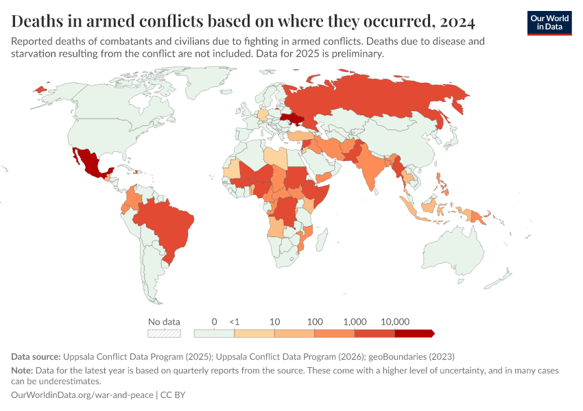 Our team has created two additional Data Explorers to make even more data on armed conflicts and war easier to access and understand. They provide and explain data from six leading datasets: on how deadly and common they are, which countries are involved, and where they take place. You can learn more about which measure and data source can best answer your questions in our articles explaining the metrics and datasets.