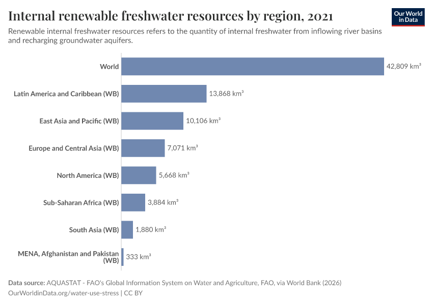 Renewable internal flows are, therefore, an important indicator of water security or scarcity. If rates of freshwater withdrawal begin to exceed the renewable flows, resources begin to decline. The chart shows the level of renewable internal freshwater resources per capita.