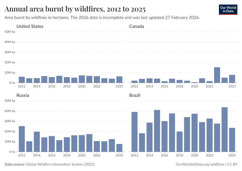 Veronika Samborska and Hannah Ritchie (2024) - “Wildfires” Published online at OurWorldinData.org. Retrieved from: 'https://owid-bot-svg-tester-thumbnai.owid.pages.dev/wildfires' [Online Resource]BibTeX citation
