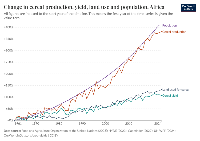 In the chart below we have mapped four variables: total cereal production; average cereal yield; land area used for cereal production; and total population. These are measured as an index relative to their respective values in 1961 (i.e. 1961 is equal to 0).