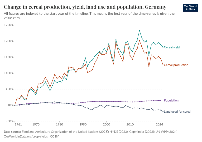 Here we use Germany as a representative of a high income country with a stable population size—in this regard, its trends are similar to many countries across Europe. Below we see that despite a roughly constant population size, Germany’s cereal output has continued to increase. Like the United States, the total land used for cereal production has marginally declined over this period. Increases in cereal output have therefore been achieved through yield improvements alone.